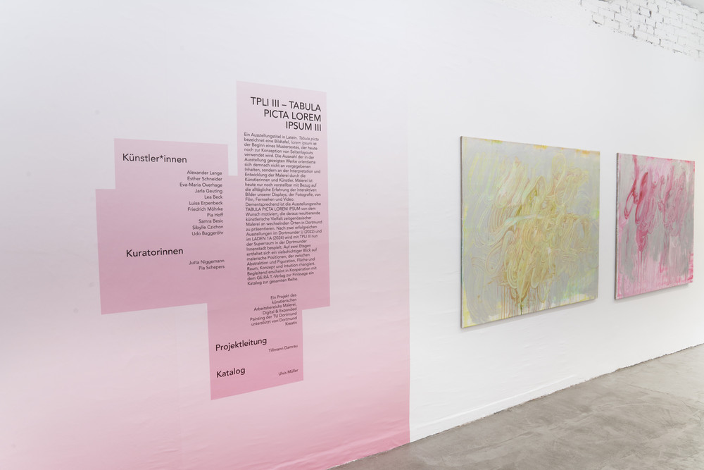 Die Ausstellungsreihe TABULA PICTA LOREM IPSUM ist von dem Wunsch motiviert, die künstlerische Vielfalt zeitgenössischer Malerei an wechselnden Orten in Dortmund zu präsentieren. Nach zwei erfolgreichen Ausstellungen im Dortmunder U (2022) und im LADEN 1A (2024) wird mit TPLI III 2025 der Superraum von DORTMUND KREATIV bespielt.