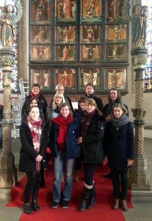 Die in den Seminarsitzungen erarbeiteten Themen ergaben am 9.2.2013 einen ganztägigen Vor-Ort-Termin als „Offener Workshop" für alle Interessierten der Pfarrgemeinde, der Stadt Schwerte und von außerhalb. Die Studierenden haben selbst die Planung, Bewerbung und Umsetzung dieses Tages übernommen. Sie haben Ergebnisse der internationalen Forschung zusammengefasst, auf das Schwerter Retabel bezogen und auch eigene Überlegungen dazu eingebracht und zur Diskussion gestellt. Zur Sprache kamen die in der Antwerpener Malereitradition entdeckten Motiverfindungen nach Graphiken Albrecht Dürers, die praktizierte Arbeitsteilung der Gildemitglieder, die Exportproduktion Antwerpens in Europa und - bei dem nachmittäglichen Treffen vor dem Original - die Techniken der Maler und Skulpturenschnitzer, die am Objekt sichtbaren Spuren des Herstellungsprozesses, sowie die Hypothese zur spätmittelalterlichen und die heutige Nutzung am ursprünglichen Standort in St. Viktor.